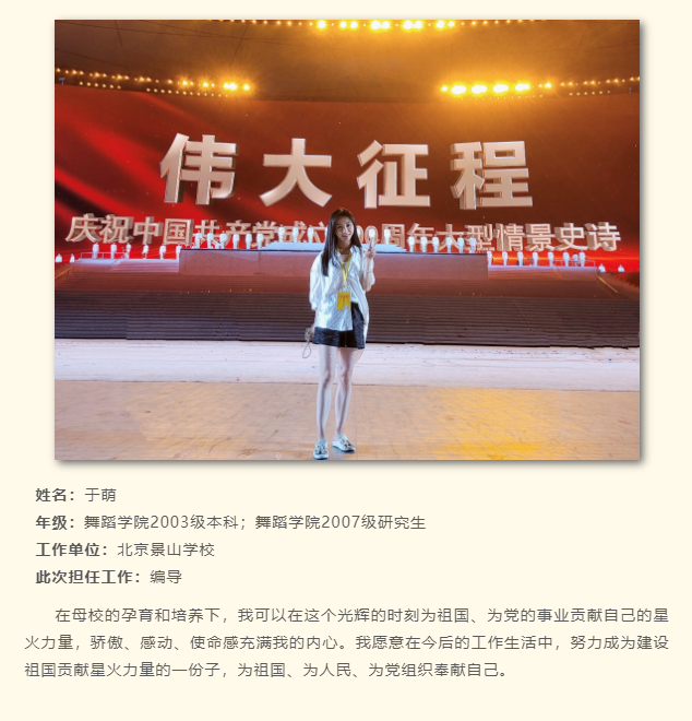历经了10个月300多天的时间,我与9名编导和1659名演员共同完成了第四篇章《东方奇迹》的创作和呈现,我们以高质量的演出节目向党向国家向人民交上了满意的答卷。在排练中,无论再苦再累,我们始终秉承着一个共同的信念:在享受着无数革命先辈用鲜血和生命换来的和平盛世的当下,我们没有理由不为之拼搏努力,我们一定要克服困难,圆满完成党交给我们的任务,这是我们的光荣也是我们的责任。在我的带动下,我的爱人和孩子全部投入到《伟大征程》的文艺演出当中,通过这几次精神的洗礼,我愈加浓烈地感受到没有共产党就没有今天的幸福生活的强烈精神冲击。在今后的工作、生活中,我将更加严格要求自己,感党恩,听党话,跟党走,干实事,履行职责和义务,做一名有信仰有理想的模范教师,为民族舞蹈教育事业奋斗一生。