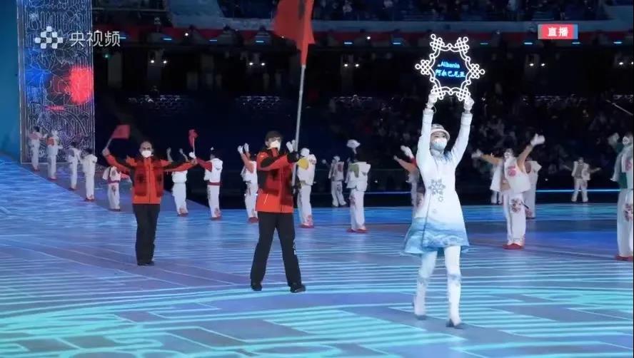 手持雪花引导牌,身穿雪花小礼裙,二人麻将2020级表演女班张梦颖及2020级英才女班刘思雨两名学子作为阿塞拜疆代表团引导员及新西兰代表团引导员,迈着自信的步伐向观众走来,向世界走来,她们是冬奥会开幕式上一道亮丽的风景,向世界展现了中华民族意气风发、朝气蓬勃的精神面貌。