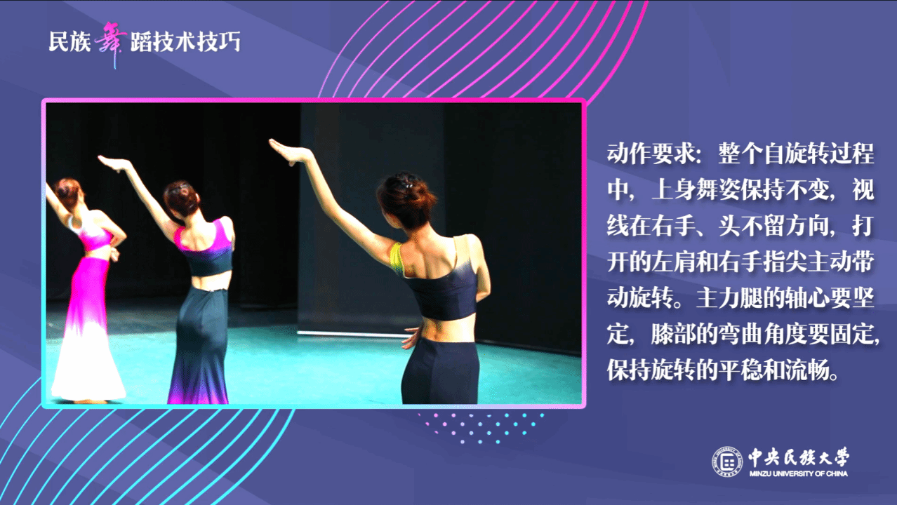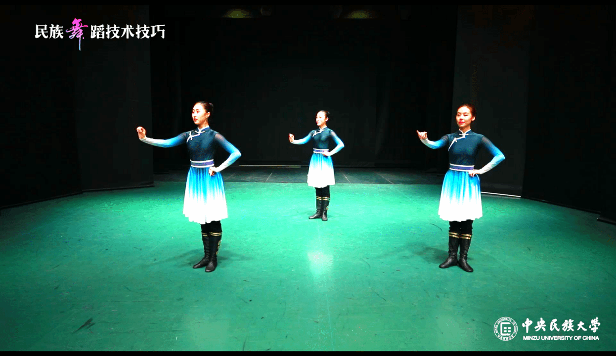 本科教学的特色课程,以解决民族舞蹈人才在技术能力训练中 “技术与形态相融、技术与风格相通”的问题,专为民族舞蹈人才的特色技能发展而设计。课程采用既独立(不同民族风格的个性技巧)、又统一(多民族的共性发力特点)的教学模式,实现多元下的统一,即在同一门课程中打造多种民族风格的技术技巧。教材既保留民族风格的传统性又兼顾时代审美,既提炼各类技术技巧中的共性特征,又保留了不同民族的形态、韵律及气质。课程立足于从“田野——课堂——舞台”又“回归田野,融入人民群众”的原则,在教学中传承,在剧目中发展,兼顾向大众的普及。面对专业学生和广大舞蹈爱好者,课程实现了兼顾高精尖人才的培养与广大舞蹈爱好者共享同一教学平台的双向教学功能。