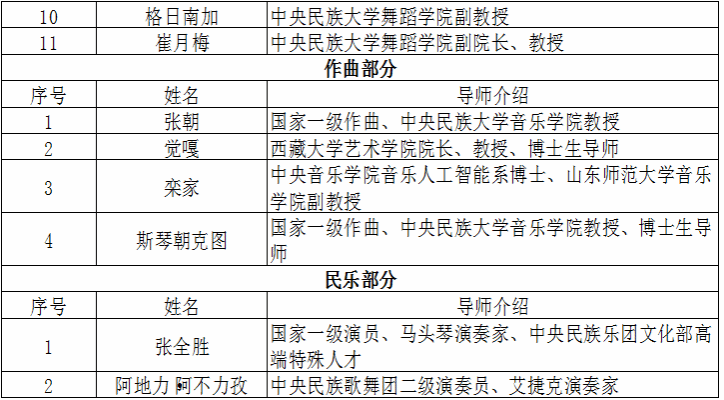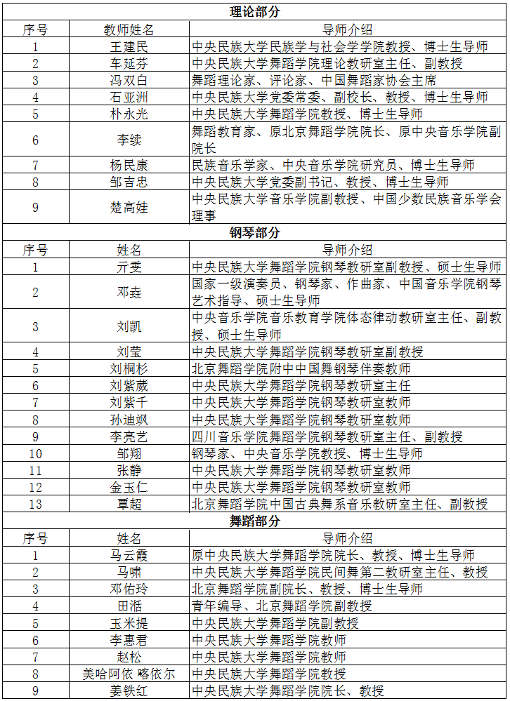 、中央民族歌舞团、中央民族乐团、中国舞蹈家协会、中国音乐家协会等高校、团体、协会的专业师资,组建了由权威音乐理论家、钢琴演奏家、舞蹈教育家、舞蹈理论家、民族音乐作曲家联手打造的强大教学团队,致力于培养高质量的民族舞蹈钢琴艺术指导专业人才。