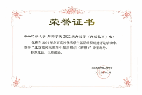 2022级舞蹈学(舞蹈教育)班。班级融汇6个民族,秉持“美美与共,知行合一”的校训。两载春秋,班级成员硕果累累:发明专利2项,发表高质量论文13篇;斩获“青创北京”2024年“挑战杯”首都大学生创业计划竞赛银奖,全国大学生职业规划大赛(2024)北京赛区二三等奖等多项创业奖项;省部级舞蹈奖项3项;2人次荣膺国家奖学金3次,1人次获“北京市三好学生”等殊荣,彰显了班级在舞蹈教育及艺术创新领域的卓越成就与引领魅力。