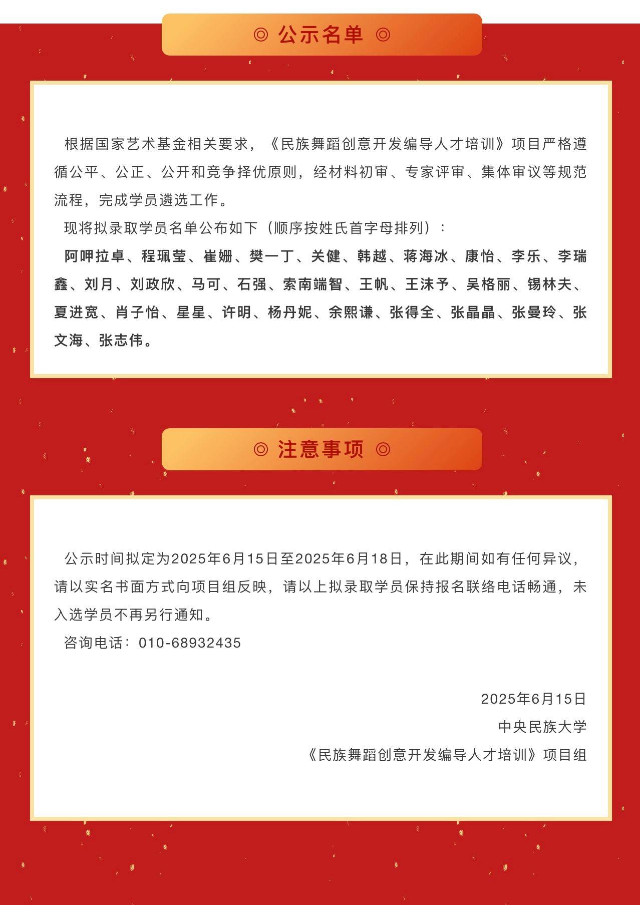 国家艺术基金《民族舞蹈创意开发编导人才培训》拟录取学员公示名单