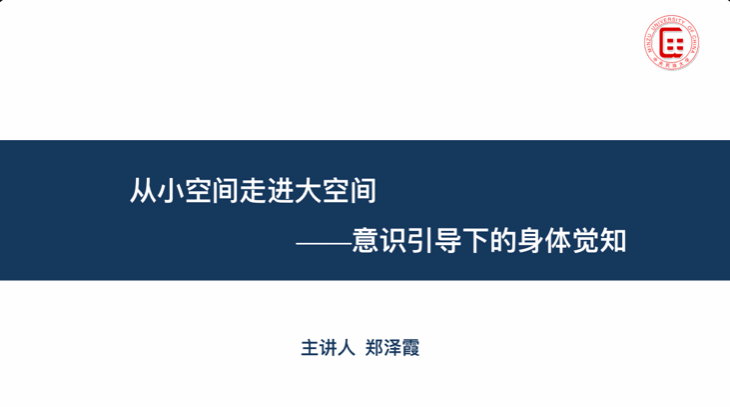 接着,郑泽霞向大家阐释了不同的空间维度理念和身体结构,并分享了她通过实践对“雁形”训练法中的专业术语“立体田字格”结构的感受与体会,使在场观看、聆听与思考的老师和同学仿佛置身于中国传统文化“空寂幽玄、自由浪漫”的美学意境当中,感悟到古代天人合一的传统哲学思想,身体觉知感悟能力和意识领域有了更清晰的判断和定位。
