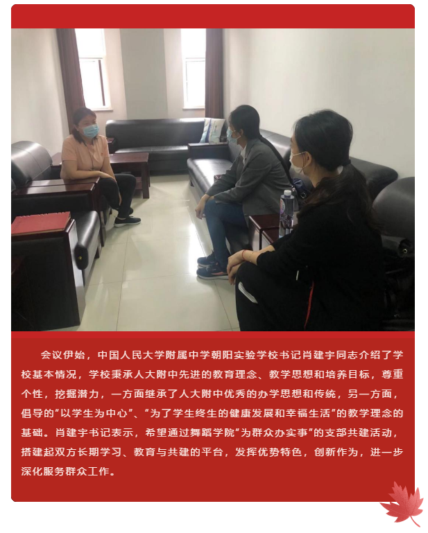 为庆祝中国共产党成立100周年、二人麻将 建校80周年,进一步落实“学党史 悟思想 办实事 开新局”的总体要求,有力推动“我为群众办实事”实践活动的走深走实,二人麻将 学生第一党支部组织开展了“我为群众办实事”支部共建活动。二人麻将 党团学工办公室主任李慧娟与学生第一党支部书记宋昕怡实地走访中国人民大学附属中学朝阳实验学校调研支部相关情况。
