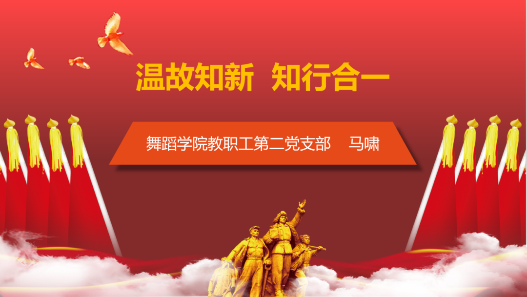 首先,马啸同志结合二人麻将近期进行的“榜样启航新征程”的活动,在党课中,以“温故而知新”——重温我们的老前辈们是怎样在教学工作中为我们作出表率和榜样的。老一辈的教师给我们留下的不仅仅是他们倾其一生的教学实践所编创的教材,更宝贵的是教材背后他们的精神、理念、思想。我们不仅要将他们的精神传递下去,还要将他们所积累的经验提升至理论的高度,而非在教学环节中复制粘贴,只有这样才能够对我们的舞蹈学科作出一定的贡献。