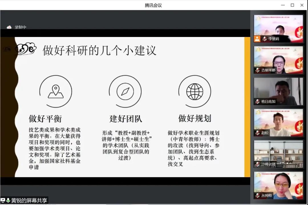 教师做好科研工作提出了“做好平衡、建好团队、做好规划”三项宝贵的建议,并与全体教师共勉:时间只记住精品,艺术只承认一流!