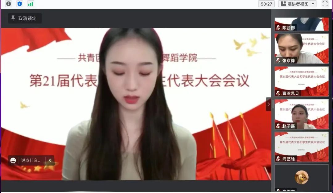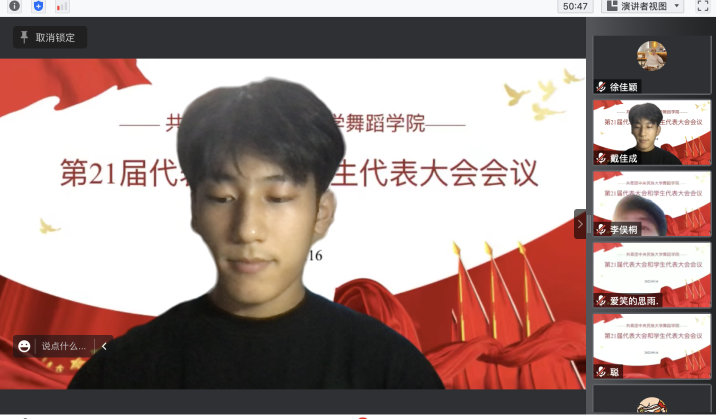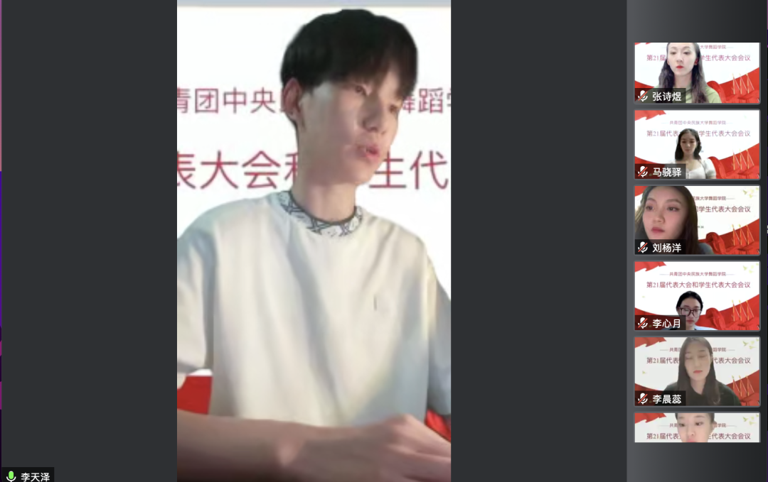 团委过去一学年的工作进行汇总报告,并鼓舞同学们不断努力,奉献青春力量,书写舞院学子更加精彩绝伦的生动故事。学生会主席李天泽就过去一学年学生会工作情况进行简要总结与报告,并认真反思总结经验,为下一届团委、学生会成员们指明工作方针,表示希望同学们接好团学组织干部的接力棒,大胆实践,勇于创新,开创团学组织新篇章。