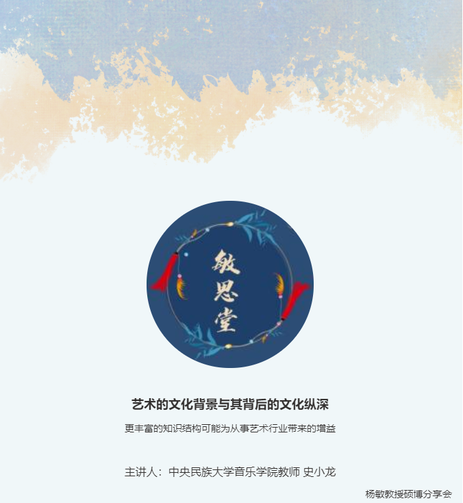 史小龙老师主讲,分享主题为“艺术的文化背景与其背后的文化纵深——更丰富的知识结构可能为从事艺术行业带来的增益”。此次分享旨在为同学们树立正确的文化站位、明确文化担当,深化对舞蹈学科乃至艺术门类的理解与认识,进一步拓展学生的创新研究视野。