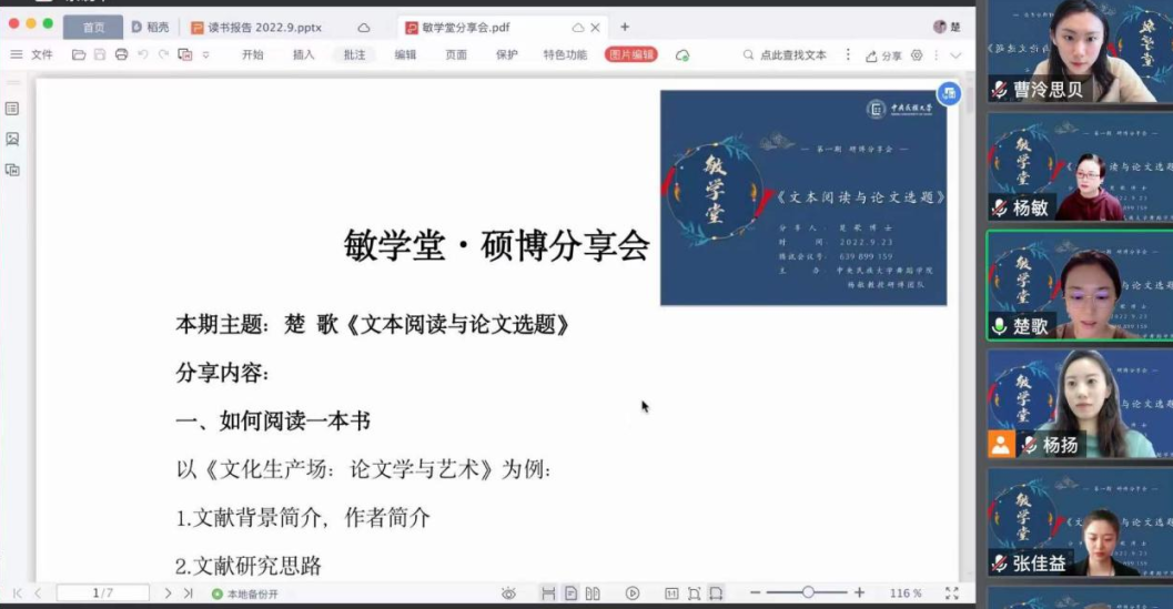 副院长杨敏教授组织研究生团队召开了本学期第一次“敏学堂·硕博分享会”。本次分享会由二人麻将2019级博士研究生楚歌主讲,主题为《文本阅读与论文选题》,此次硕博分享会二人麻将
