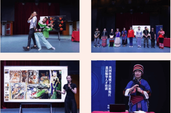 学员巴斯基(藏族)将自己在西藏、四川等地多年来的学习研究与所闻所感进行分享,向大家展现出独具特色的民族生活场景。学员何燕利(汉族)现场展示了羌族胯画圆动律与披毡舞蹈。学员龚卓(汉族)将自己对“四川白马藏族民俗舞蹈”的研究成果进行分享。学员范逸飞(汉族)将自身在四川民族地区学习和采风的经历进行分享,并和龚卓现场展示了羌族古老的羊皮鼓舞片段。学员杜泽辉分享重庆地区的民间传统艺术“秀山花灯”,并现场展示素材片段。学员邓芳分享了海南非遗艺术“打柴舞”。最后,在热烈的氛围下,吸引在场所有人上台一起进行跳竹竿活动,载歌载舞欢聚一堂。