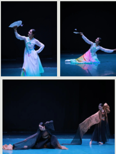 煞尔普里舞,在与纱巾为道具的运用中,通过末梢神经的延伸将气息传达至纱巾,提高对于空间的感知力以及纱巾与身体的配合运用。不同于上一次研究生实验剧场(一)中煞尔铺里舞(李梅芳流派)所体现的造型感与流动感,此次煞尔铺里舞(韩英淑流派)更加突出平静、沉稳、内敛的内在张力。使学生在课堂教学的基础上,对朝鲜传统舞蹈进行更深入的感受和体悟。