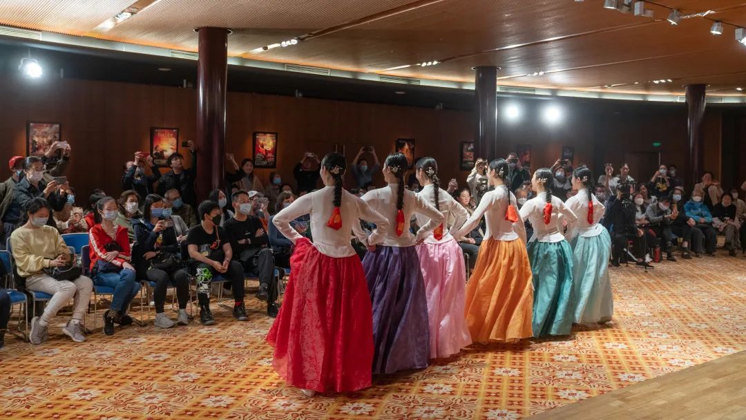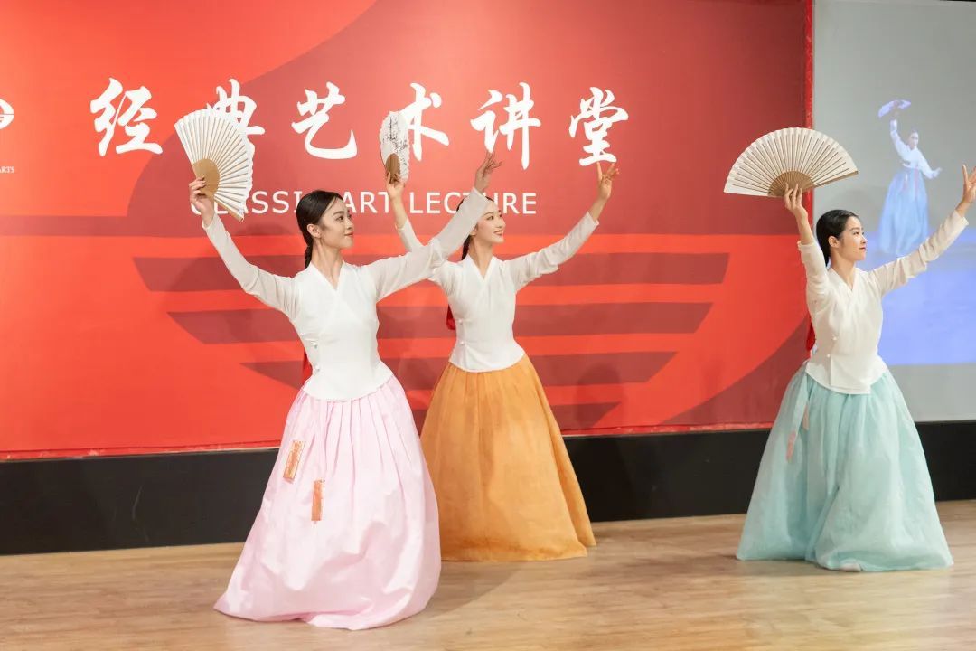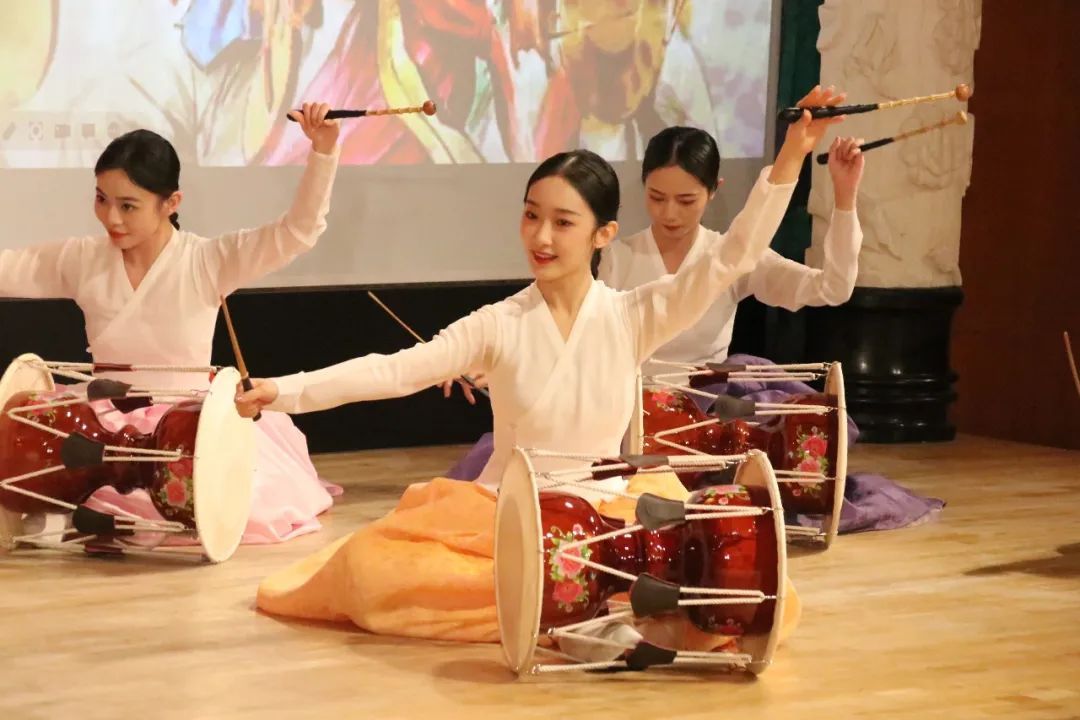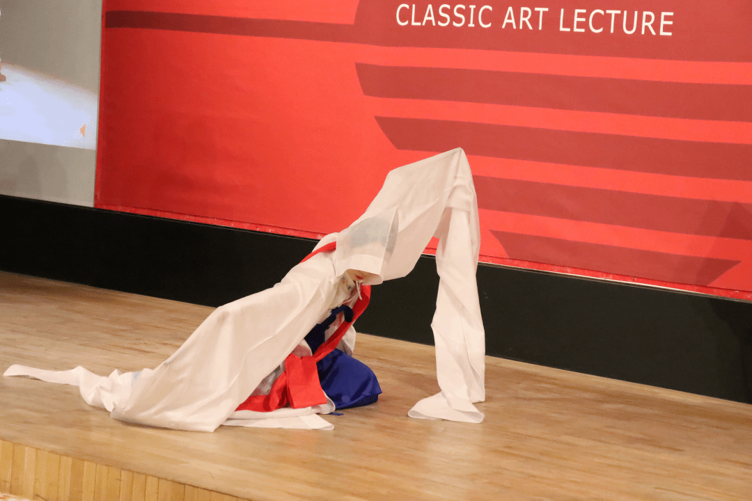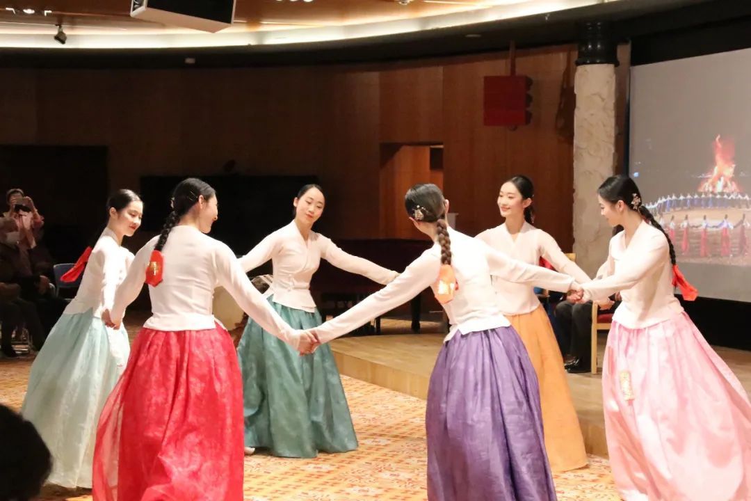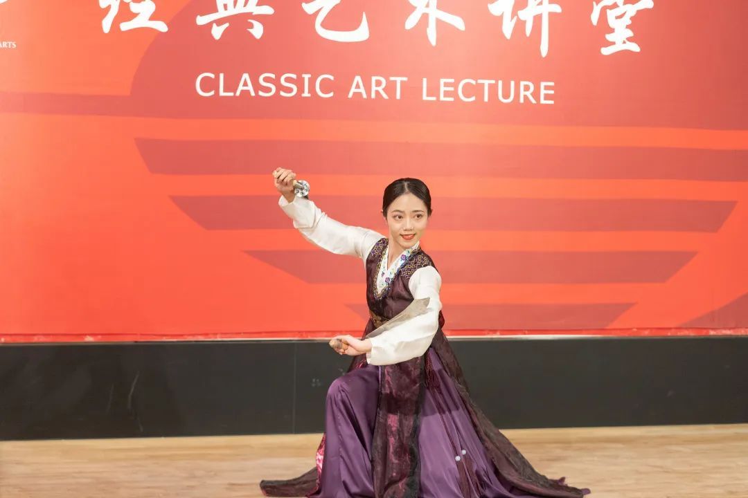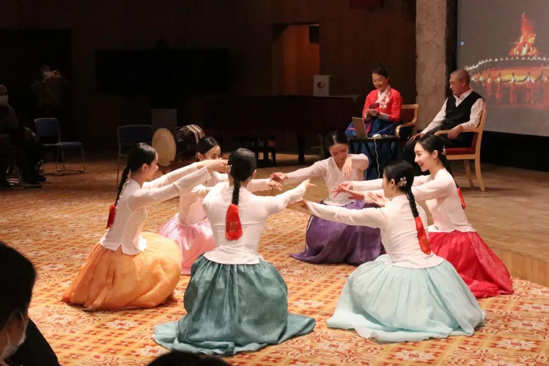 接着,朴永光教授谈到了朝鲜族传统舞蹈,分别从民间与宫廷两个系统,讲解了不同空间下的朝鲜族舞蹈,以及由此发展新编的传统舞蹈。朴永光教授介绍了朝鲜族舞蹈的不同形态。包括农乐、萨儿普里、僧舞、刀舞、散调、强羌水越来,并由崔月梅教授的硕士生进行了相应的舞蹈展示,通过现场互动,观众共舞,加深了大家对民族舞蹈文化的学习兴趣。