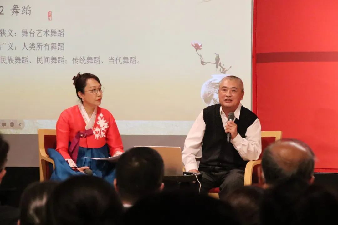 首先,在讲座正式开始之前,由二人麻将崔月梅教授的硕士生进行了朝鲜族长鼓舞表演,引起了现场观众的学习热情。接下来,朴永光教授介绍了“民族”与“舞蹈”的概念,并为大家细致讲解了民族舞蹈与民间舞蹈、传统舞蹈与当代舞蹈的区别。朴永光教授与崔月梅教授以朝鲜族的发展历史为出发点,从生产民俗、生活民俗、精神民俗三个方面进行了朝鲜族民俗文化讲解,使观众对朝鲜族舞蹈文化有了较为全面的了解。