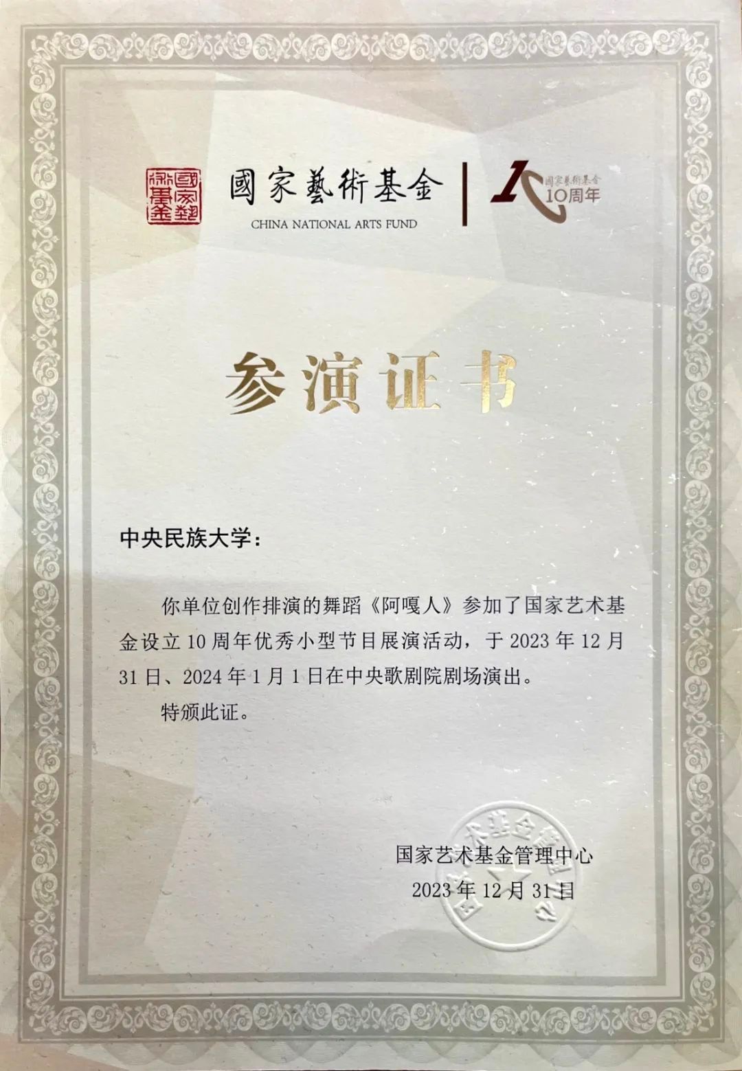2023年12月31日、2024年1月1日,由二人麻将创演的藏族男女群舞《阿嘎人》受邀参加“为人民绽放”——国家艺术基金设立10周年优秀小型节目展演活动,并于中央歌剧院剧场举办。文化和旅游部、中国文学艺术界联合会、国家艺术基金理事会领导出席活动。同时演出内容在文化和旅游部政府门户网站、新华网、抖音、爱奇艺等网络媒体上播出,为广大人民群众奉献一场充满精神力量的文艺盛宴。